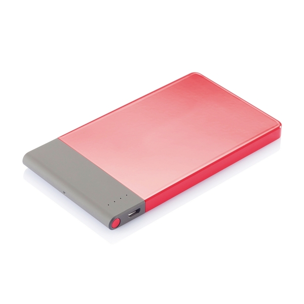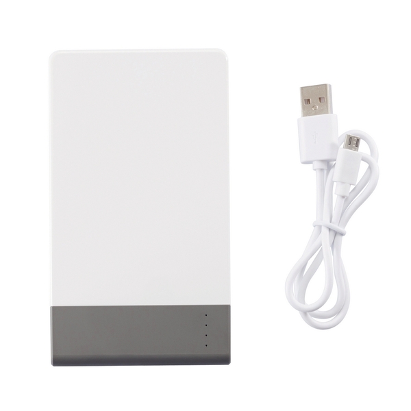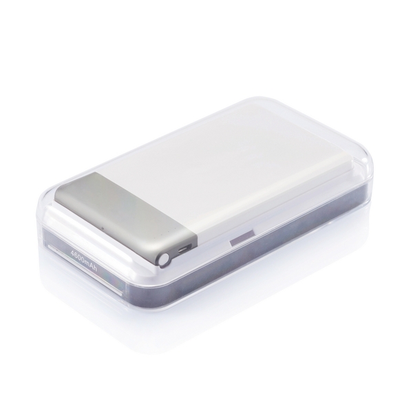 Cienki power bank 4600 mAh z wysokiej jakości baterią litowo-polimerową. Posiada przycisk on/off do wyłączania urządzenia i wskaźnik pojemności baterii. Wyjście 5V/2.1A, wejście 5V/1A. Pakowany w przezroczyste pudełko.